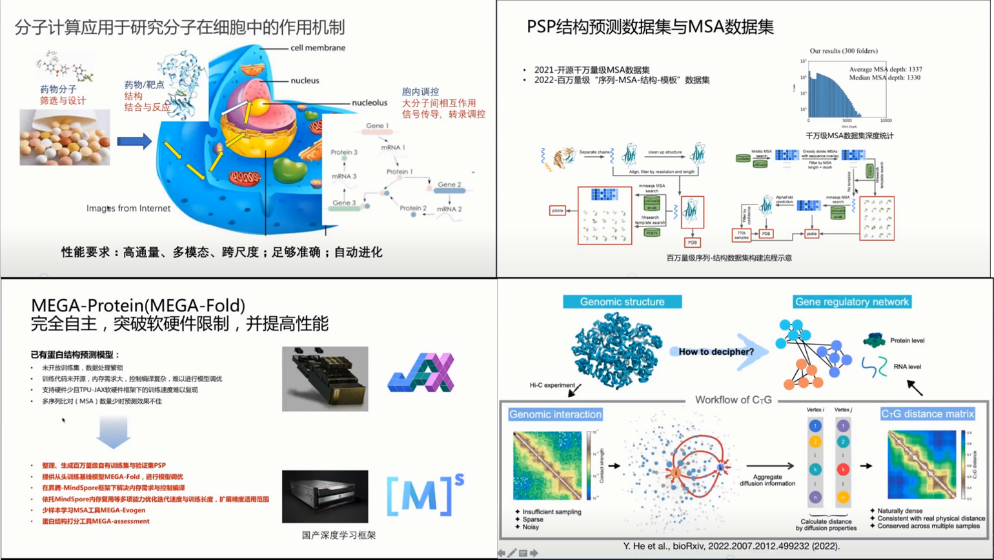 高教授从蛋白质结构预测的飞速发展出发,系统地介绍了深度学习方法和软硬件架构的发展对蛋白质结构模拟的理论支持。近年来,深度学习方法的发展为分子模拟的进步提供了新的支撑和思路,特别是在蛋白质结构预测和加速计算等方面都有重要的潜力。其中,Alphafold2为蛋白质结构预测方向的发展提供了新的可能,但这个模型还存在很多短板,如准确性低,软硬件要求高,存在被“卡“的风险。本次报告中,高教授重点介绍了其团队与华为合作研究了完全自主的MEGA-Protein,进行了国产软硬件架构下对蛋白质结构预测任务的实现和质量评估模型的把控,并针对目前分子模拟中的瓶颈问题提出了一些解决方案。本次报告深入浅出地讲解了蛋白质结构模拟的发展,使我们对分子模拟有了更加深入和清晰的认识。